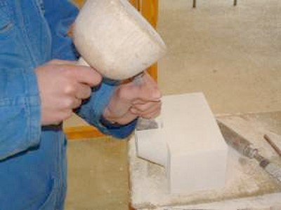 Il travaille sur tous types de roche. Les équipements de protection (masque et lunettes) sont indispensables pour se protéger des poussières dégagées par la taille du matériau.